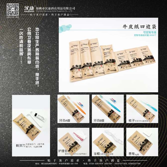 湖北汉康工贸有限公司是维达公司江汉平原(仙桃、天门、潜江、洪湖)特约经销商,长年提供各种高中档餐巾纸、方巾纸、钱包纸巾、盒装纸、擦手纸、卷筒纸、公用卫卷等纸品;筷套、桌布、口布、点菜单、酒水单等印刷单据;床单、被套、枕套、枕芯、云丝被、羽绒被、床垫、方巾、面巾、地巾、浴巾等客房布草;牙具、梳子、香皂、拖鞋、浴帽、洗发液、淋浴液、杂件、清洁用品等一次性客房用品。