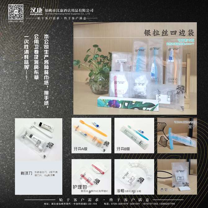 湖北汉康工贸有限公司是维达公司江汉平原(仙桃、天门、潜江、洪湖)特约经销商,长年提供各种高中档餐巾纸、方巾纸、钱包纸巾、盒装纸、擦手纸、卷筒纸、公用卫卷等纸品;筷套、桌布、口布、点菜单、酒水单等印刷单据;床单、被套、枕套、枕芯、云丝被、羽绒被、床垫、方巾、面巾、地巾、浴巾等客房布草;牙具、梳子、香皂、拖鞋、浴帽、洗发液、淋浴液、杂件、清洁用品等一次性客房用品。